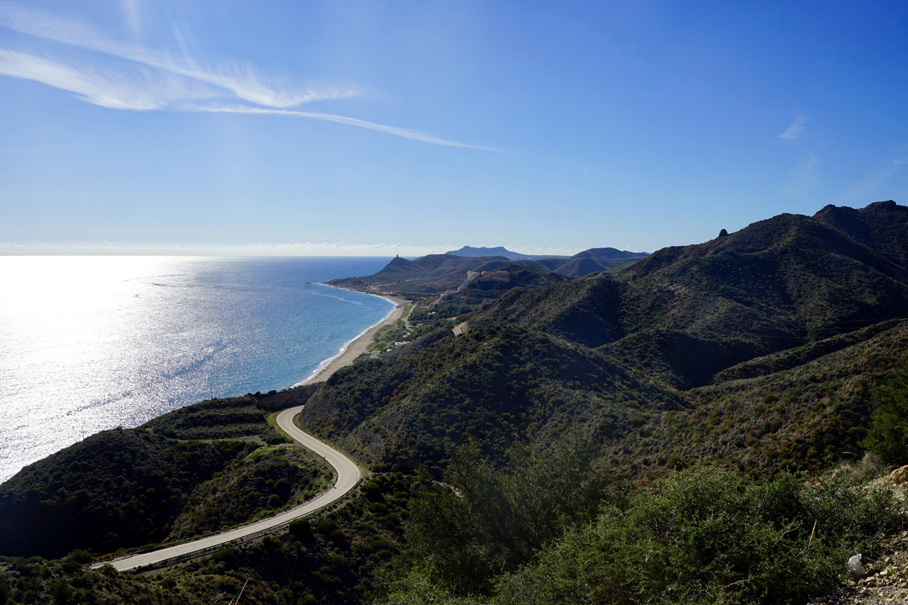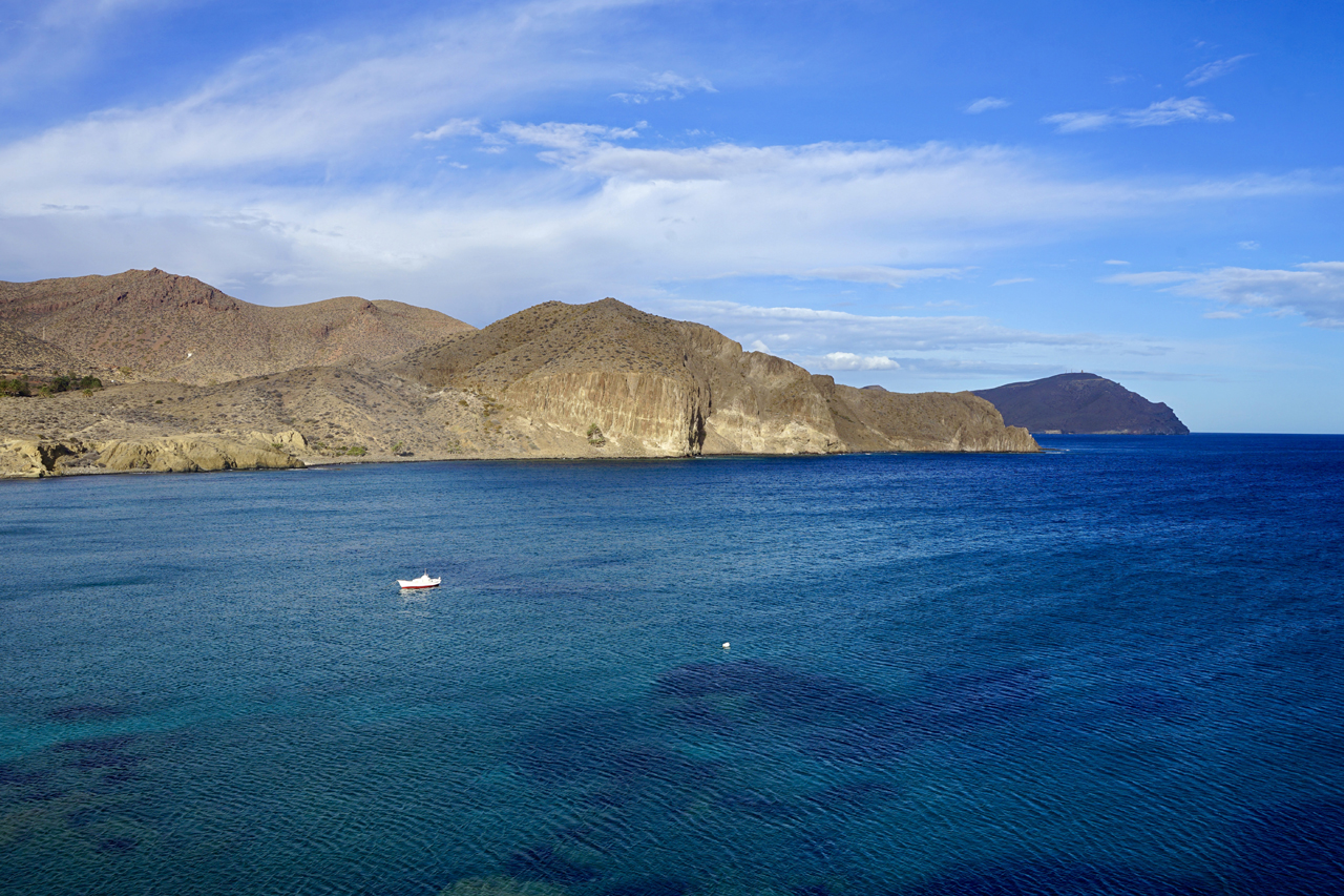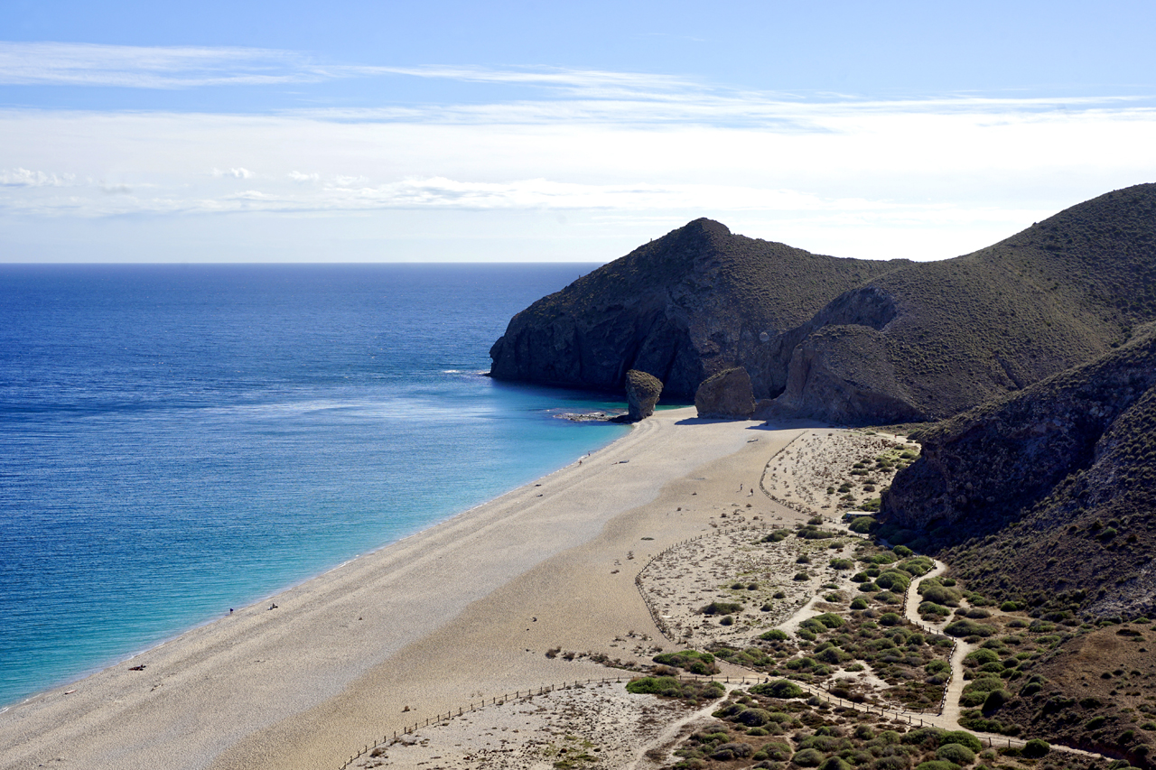 Grazil und rau zugleich: Es gibt tatsächlich immer noch wunderschöne Naturstrände, an denen man (fast) seine Ruhe hat, in Andalusien. Cabo de Gata, ein landschaftlich wertvoller Küstenstreifen an einem der letzten unverbauten Küstenabschnitte des Mittelmeeres und ein naturbelassender Ort, der seinen urigen Charme bewahrt hat. Auf der einen Seite ist der Cabo de Gata in Spanien ein Naturpark unter vielen. Und dennoch ist die Landschaft etwas Besonderes, die von vulkanischen Bergen und Halbwüsten gesäumt wird. Landesweit ist diese Region das letzte unverbaute Areal der andalusischen Mittelmeerküste. Hier habe ich Ursprünglichkeit in Vollendung erlebt: wilde Steilklippen, ein sauberes Meer, lange Sandstrände, abgelegene Felsbuchten und kleine Ortschaften. Die Feldwege führen durch ausgetrocknete Flussbetten, vorbei an stillgelegten Gleisen und über erloschene Vulkane und Sandstrände quer durch den Park. Die innere Leere des Sinnsuchenden findet unter anderem hier seine Entsprechung. Es ist nahezu fast ausgestorben. Man ist allein an einem riesigen Strand. Keine Bar und eine Weite, die man nicht gewohnt ist. Der Massentourismus hat die Region wohl noch verschont und doch weht ein sanftes Lüftchen, das in einigen Nischen schon zu den andalusischen Blütezeiten wehte und womöglich heute davor steht, aufzufrischen. Die Gebirgskette Sierra de Cabo de Gata ist vulkanischen Ursprungs. Das Kap Cabo de Gata ist am südöstlichsten Zipfel der Provinz Almería gelegen. Dieser 1997 zum Biosphärenreservat erklärte Naturraum umfasst den gesamten Naturpark Cabo de Gata-Níjar sowie einen Teil von dessen Umgebung. Das Gebiet wurde auch zum besonderen Vogelschutzgebiet (ZEPA) erklärt und als bedeutendes Internationales Feuchtgebiet in das Ramsar-Abkommen aufgenommen.